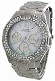 Polished silver-tone case and bracelet with crystals and genuine mother of pearl multi-function dial (day, date, and international time). Crystallized with Swarovski®. WaterPro®. Water resistant 10ATM/330Ft. 10-year limited warranty.