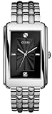 Dress watch, Japanese quartz movement, Silver-tone hands with sweep seconds, Genuine diamond dot marker at the 12-position, Polished silver-tone dot marker at the 6-positon, Applied polished silver-tone baton markers at the 3- and 9-positions, Polished silver-tone stainless steel rectangular case, Textured steel crown, Stainless steel caseback, 50 meters/165 feet water resistant
