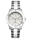 Multifuction:Day, Date, 24 Hour/Intl. time 41/41/12 Brushed silver-tone case + White top ring case White textured enamel dial Brushed Steel and white polycarbonate bracelet 100 M/330 FT 10 year warranty Women's Accessories > Watches > Guess Watches