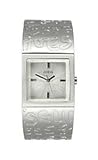 Style with a message. This hip GUESS watch features a graffiti-embossed silvertone mixed metal bangle bracelet and square case. Silvertone dial with stick indices and logo. Quartz movement. Water resistant to 100 meters. Ten-year limited warranty.