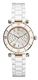 Rose Gold and White Ceramic Case White Ceramic Bracelet White Mother of Pearl Dial Swiss Made Day and Date Display Band Color: White; Band Width: 16mm near case; 16mm near clasp/buckle; Bezel Color: White; Case: Rose Gold + Circle-shaped; Case Finish: Polished + Stainless Steel; Case Thickness: 11mm; Case Width: 32mm; 36mm with crown; Clasp / Buckle: Deployment; Dial: White + analog; Hand Color: Rose Gold; Movement: Swiss + quartz; Time Zones: Single; Water Resistance: 10 atm;