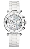 Stainless Steel and White CeramicCase White ceramic Bracelet White Mother of Pearl dial Chronograph Date Display Case Diameter 38 mm Screw Down Crown Push Button Deployment Clasp Water Resistant to 100 M Swiss Movement Band Color: White; Band Width: 16mm near case; 16mm near clasp/buckle; Bezel Color: White; Case: White + Circle-shaped; Case Finish: Polished + Stainless Steel; Case Thickness: 12mm; Case Width: 38mm; 41mm with crown; Clasp / Buckle: Deployment; Dial: White + analog; Hand Color: Silver; Movement: Swiss + quartz; Time Zones: Single; Water Resistance: 10 atm;