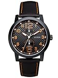 Day + Date Dimensions in mm: 45/45/11 Ionic Black case Black Carbon-fibre texture w/ Orange details dial Black Leather strap 100 M/330 FT 10 Year Limited Warranty Men's Accessories > Watches > Guess Watches