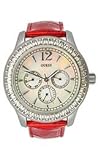 This eye-catching unisex watch by GUESS looks great from day into evening. Croc-embossed red leather strap and round silvertone mixed metal case. Crystal accents at bezel. Mother-of-pearl dial with silvertone stick indices, logo and three subdials. Quartz movement. Water resistant to 50 meters. Ten-year limited warranty.