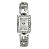 Dress watch, Two-hand Japanese quartz movement marked by gunmetal hands, Applied gunmetal batons mark quarter hours, Polished silver-tone metal rectangular case encrusted with clear crystals, Silver-tone crown, Stainless steel caseback, 30 meters/100 feet water resistant