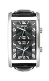 Casual watch, Quartz movement, Dual time, Polished silver-tone hands, Arabic numbers, Roman numbers and markers, Polished silver-tone stainless steel rectangular case, crowns and caseback, 50 meters/165 feet water resistant