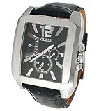 Rich black leather with the look of crocodile sets off an art deco face with creative day/date display.Mineral CrystalGenuine Leather StrapSilver-tone stainless steel rectangular caseBlack Textured Sundial with three multi-function subdialsJapanese Quartz Movement 50 meters/165 feet water resistantComes with GUESS box