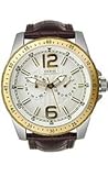 Classic metal tones and luxe leather lend a handsome edge to this GUESS watch. Brown croc-embossed leather strap and round silvertone mixed metal case. Bezel features goldtone ring. Textured white dial with goldtone stick indices, numerals at twelve and six o'clock, and day and date subdials. Quartz movement. Water resistant to 100 meters. Ten-year limisted warranty.