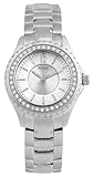 Quartz movement, Dress watch, Silver-tone luminous hands, Silver-tone 12 o'clock, indices and dot markers, Black indices on outer dial, Polished stainless steel coin-edge bezel is set with crystals, Brushed stainless steel case, Polished stainless steel crown and caseback, 100 meters/330 feet water resistant