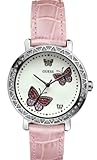 Quartz movement Polished stainless steel case Clear crystals on the bezel White dial with crystal butterfly Pink Pearlized Croco leather strap 50m water resistant Mineral crystal dial Band Color: Light Pink Leather; Band Width: 16mm near case; 15mm near clasp/buckle; Bezel Color: Multicolor; Case: Silver + Circle-shaped; Case Finish: Polished + Stainless Steel; Case Thickness: 10mm; Case Width: 36mm; 37mm with crown; Clasp / Buckle: Strap Buckle; Dial: White + analog; Hand Color: Silver; Movement: Japanese + quartz; Time Zones: Single; Water Resistance: 5 atm;