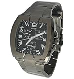 When you think of style, this is definitely a watch to look at. It has a stainless steel case and band with a deployment clasp. Featuring a black analog display with a quartz movement movement, this watch is built to last.It has 3 subdials, one for the day, date, and 24 hour time. Water resistant to 100m. You wont want go anywhere without wearing this watch.