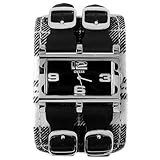 Originality and sophistication make the GUESS Women's Tartan Overlay Strap Watch a brilliant addition to your trend-setting wardrobe. This elegantly crafted timepiece features a black dial with silver-tone trim, silver-tone hands and prominent cutouts shaped to show off the distinctive GUESS question mark and the GJ logo, while allowing a white-and-gray tartan backdrop design to peak through. A wide black and white tartan band with a black leather overlay featuring chic cutouts complements the striking rectangular face, which is protected by a mineral window and framed by a stainless steel bezel and case. Silver tone hands offset the dial. A buckle clasp holds this daring dress watch in place, while analog-quartz movement ensures its reliable performance.