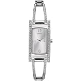 This tremendous quartz analogue ladies timepiece crafted by Guess features a silver stainless steel bracelet and a stainless steel case which compliments the silver dial. The rectangular crystal-set case continues crystals down the silver band. This watch is water resistant to 30 meters (100 feet).