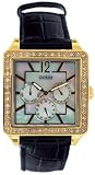 Quartz movement, 35mm by 35mm square gold-tone case surrounded by crystals, mother of pearl dial with gold-tone markers, luminous hands, three subdials for day, date and 24-hour display, genuine black leather band, water resistatnt.