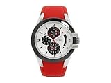 Multifunction: Day, Date 24 Hour/Intl. time 44/44/14 Brushed Silver-tone case with black + polished silver top ring White + Black dial Red Silicone strap 100 M/330 FT Water resistant Men's Accessories > Watches > Guess Watches