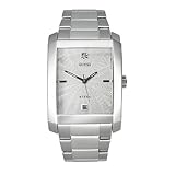 Band Color: Silver Metal; Band Width: 24mm near case; 22mm near clasp/buckle; Bezel Color: Silver; Case: Silver + Rectangle-shaped; Case Finish: Polished + Stainless Steel; Case Thickness: 11mm; Case Width: 33mm; 35mm with crown; Clasp / Buckle: Deployment; Dial: Silver + analog; Hand Color: Silver; Movement: Japanese + quartz; Time Zones: Single; Water Resistance: 1 atm; Other Features: Genuine diamond hour markers
