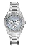 Add a little glitter and glam to your wardrobe with this unique timepiece. Silver tone metal bracelet band. Clear crystal covered bezel. Crystallized by Swarovski Mother of pearl multifunction dial including day, date and 24 hour military time. Three hand movement. Sport clasp closure. Self-adjustable links. Dimensions: Face 32mm W x 32mm H Face Depth 10mm Band Width 21mm Band Circumference 9 inches