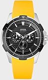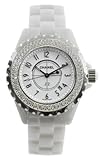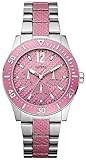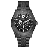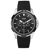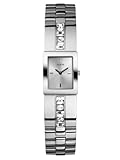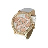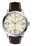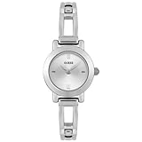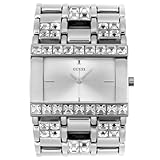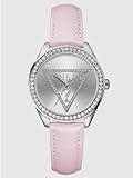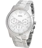 Wispy and light, the Guess Collection white leather watch from GUESS makes an airy impression with its light tones. A bright white dial with light silver Arabic numerals and indexes glows with reflected light. Silver hands with luminous tips travel around the dial driven by Swiss-quartz movement. Two shiny silver sub-dials are also included and display the day and date. Encircling the mineral-crystal-protected dial is a polished stainless steel, coin-edge bezel with imprinted Arabic numerals and indexes for additional reference. The 37-millimeter case is constructed of stainless steel and secured by a 16-millimeter white leather band with a deployment clasp. This watch is water resistant to 330 feet.