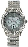 Quartz movement Polished stainless steel bracelet Mineral crystal Mother of Pearl dial with crystal pave Multi function dial Crystal bezel 50m water resistant