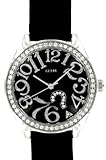 Band Color: Black Leather; Band Width: 16mm near case; 16mm near clasp/buckle; Bezel Color: Crystals; Case: Silver + Circle-shaped; Case Finish: Polished + Stainless Steel; Case Thickness: 10mm; Case Width: 37mm; 39mm with crown; Clasp / Buckle: Strap Buckle; Dial: Black + analog; Hand Color: Silver; Movement: Japanese + quartz; Time Zones: Single; Water Resistance: 1 atm; Other Features: Swarovski crystals
