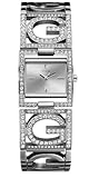 Band Color: Silver Metal; Band Width: 26mm near case; 26mm near clasp/buckle; Bezel Color: Crystals; Case: Silver + Square-shaped; Case Finish: Polished + Stainless Steel; Case Thickness: 8mm; Case Width: 26mm; 28mm with crown; Clasp / Buckle: Jewelry; Dial: Silver + analog; Hand Color: Silver; Movement: Japanese + quartz; Time Zones: Single; Water Resistance: 1 atm;