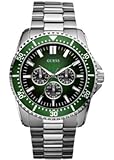 Band Color: Silver Metal; Band Width: 23mm near case; 21mm near clasp/buckle; Bezel Color: Green; Case: Silver + Circle-shaped; Case Finish: Polished + Stainless Steel; Case Thickness: 12mm; Case Width: 44mm; 47mm with crown; Clasp / Buckle: Fold Over Push Button Deployment; Dial: Green + analog; Hand Color: Glow-in-the-dark; Movement: Japanese + quartz; Time Zones: Single With 24 Hour Dial; Water Resistance: 10 atm; Other Features: Day and Date Sub-Dial