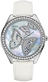 Band Color: White Leather; Band Width: 20mm near case; 18mm near clasp/buckle; Bezel Color: Crystals; Case: Silver + Circle-shaped; Case Finish: Polished + Stainless Steel; Case Thickness: 12mm; Case Width: 43mm; 46mm with crown; Clasp / Buckle: Strap Buckle; Dial: White + analog; Hand Color: Silver; Movement: Japanese + quartz; Time Zones: Single; Water Resistance: 1 atm;