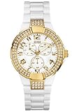 A splashy touch of glam goes with everything. This chic watch from Guess features a white polycarbonate strap and gold-tone mixed metal round case with a crystal-accented bezel.