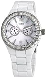 White enamel case with a white enamel bracelet. Fixedstainless steel set with emerald cut stones bezel. Mother of pearl dial with luminous silver-tone hands and crystals hour markers. Arabic numerals mark the 6 and 12 o'clock positions. Minute markers around the outer rim. Luminiscent hands and dial markers. Two sub-dials displaying: date and day of the week. Quartz movement. Scratch resistant mineral crystal. Solid case back. Case diameter: 40 mm. Push button deployment clasp. Water resistant at 100 meters / 330 feet. Functions: hours, minutes, seconds, calendar. GUESS? Ladies Stainless Steel Bracelet Watch G13552L1.