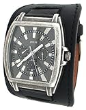39 mm stainless steel case, black textured dial with silver hands, genuine black leather cuff/strap, band is 49 mm in diameter and will fit up a 9 inches wrist, adjustable buckle clasp, Japan movement, water resistant
