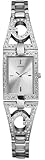 You're not known for blending in. Keep on shining with this watch by GUESS crafted of polished silver tone mixed metal bracelet with crystal-accented G-shaped links and rectangular case. Bezel embellished with crystal accents. Silver tone dial features applied stick indices at twelve three six and nine o'clock two hands and logo. Quartz movement. Splash resistant.