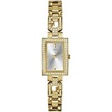 Yet another fashionable quartz analogue ladies wristwatch manufactured and designed by Guess. This wristwatch includes a gold stainless steel bracelet and a gold plated case as well as a silver dial. The watch is secured with a distinctive G-logo bracelet with matching crystal detailing and is water resistant to 30 meters (100 feet).