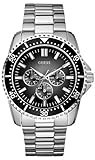 Timing is everything. This GUESS watch features a silvertone mixed metal bracelet and round case. Black bezel with white stick indices, logo and three subdials. Quartz movement. Water resistant to 100 meters.