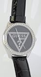 * Silver-Tone Bracelet Watch * Genuine leather strap with adjustable buckle closure.* Ladies watch * Round black color face w/ GUESS logo * Crystal around the face. * Stainless Steel back * Water Resistent * Japanese Movement* Dimensions:* Face : 38 mm (W) x 38 mm (L) x 8 mm (D)* Band width 17 mm* Band circumference 6~9 inches (1 inch = 2.54 cm) * Guess bag included, no box