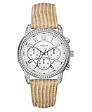 Band Color: Cream Leather; Band Width: 20mm near case; 17mm near clasp/buckle; Bezel Color: Crystals; Case: Silver + Circle-shaped; Case Finish: Polished + Stainless Steel; Case Thickness: 12mm; Case Width: 40mm; 42mm with crown; Clasp / Buckle: Strap Buckle; Dial: White + analog; Hand Color: Silver; Movement: Japanese + quartz; Time Zones: Single With 24 Hour Dial; Water Resistance: 10 atm;