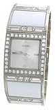 Stainless steel case with white enamel links. Brushed silver-tone dial. Rhinestone bezel. Three hand quartz analog movement. Water resistant. Case 19mm. Cace Depth 8mm. Jewelry clasp