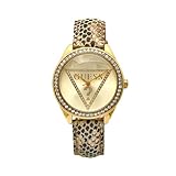 This chic timepiece by Guess for ladies offers a goldtone stainless steel case, complemented by a gorgeous python/snakeskin patterned leather strap. The goldtone dial is adorned with a crystallized Guess insignia. The beautifully designed watch features a precise Japanese movement and is protected by a scratch-resistant mineral crystal and water-resistance level of up to 30 meters.