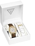 You know that watches are about so much more than telling time. Make your statement with this GUESS watch Rock Candy set. Interchangeable metallic brown and white leather straps and round goldtone mixed metal case. Bezel embellished with two rings of crystal. White dial features goldtone stick indices, numeral at twelve o'clock, three subdials and logo. Quartz movement. Water resistant to 100 meters