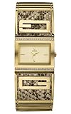 Gold-plated stainless steel case with a python leather and gold-plated steel bracelet. Gold-plated stainless steel bezel set with Swarovski crystals. Pale gold dial with gold-tone hands and stick markers at the quarter hour positions. Quartz movement. Scratch resistant mineral crystal. Solid case back. Case diameter: 30 mm. Jewelry clasp. Water resistant at 30 meters/ 100 feet. Guess Flair Trend Ladies Watch W16550I1.