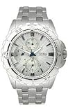 Sport watch, Japanese-Made quartz movement, Multifunction displaying 24-hour subdial and 2 calendar subdials, Main dial blue hour and minute hands with luminous accents and blue sweep seconds, Subdials displayed by blue hands, Main dial applied and polished silver-tone baton hour markers, Black lettering, numbers, and indices mark subdials while black indices reveal outer minute track, Analog day-and-date display at 9 and 12, Polished silver-tone unidirectional timing bezel, Brushed silver-tone stainless steel metal round case, Brushed grey crown protected by guards, Stainless steel caseback, 100 meters/330 feet water resistant
