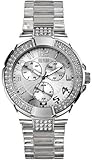Band Color: Clear Plastic; Band Width: 20mm near case; 20mm near clasp/buckle; Bezel Color: Crystals; Case: Silver + Circle-shaped; Case Finish: Flat + Plastic; Case Thickness: 13mm; Case Width: 39mm; 42mm with crown; Clasp / Buckle: Fold Over Push Button Deployment; Dial: Silver + analog; Hand Color: Silver; Movement: Japanese + quartz; Time Zones: Single With 24 Hour Dial; Water Resistance: 10 atm; Other Features: Day and Date Display