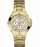 Band Color: Gold Metal; Band Width: 22mm near case; 20mm near clasp/buckle; Bezel Color: Crystals; Case: Gold + Circle-shaped; Case Finish: Polished + Stainless Steel; Case Thickness: 13mm to 9mm; Case Width: 41mm; 43mm with crown; Clasp / Buckle: Fold Over Push Button Deployment; Dial: Crystals + analog; Hand Color: Gold; Movement: Japanese + quartz; Time Zones: Single With 24 Hour Dial; Water Resistance: 10 atm; Other Features: Day and Date Sub-Dials