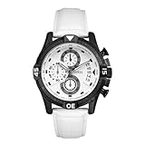 Band Color: White Leather; Band Width: 22mm near case; 19mm near clasp/buckle; Bezel Color: Black; Case: Black + Circle-shaped; Case Finish: Satin + Stainless Steel; Case Thickness: 15mm; Case Width: 44mm; 47mm with crown; Clasp / Buckle: Strap Buckle; Dial: White + analog; Hand Color: Multicolor; Movement: Japanese + quartz; Time Zones: Single; Water Resistance: 10 atm; Other Features: Date Display; Tachymeter